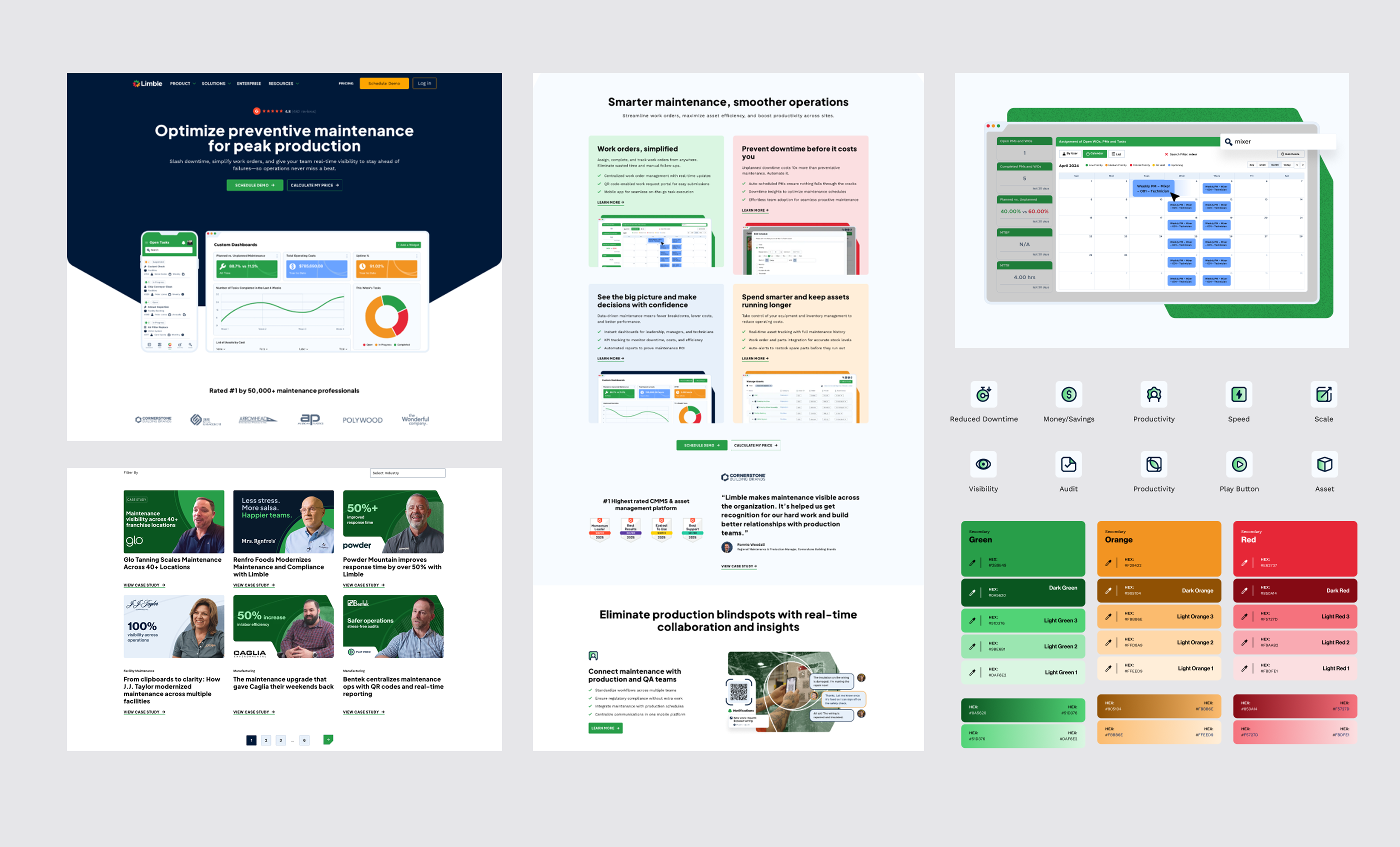 The Limble design system is intentionally bold and requires a strong understanding of grid, hierarchy, and color balance to execute well. When used thoughtfully, the combination of Limble green, black, and structured layouts creates a confident, high-impact visual language. However, if applied without discipline, it can quickly feel cluttered or amateur. Success comes from restraint—using the right amount of green to guide attention, maintaining strong alignment to the grid, and organizing content with clarity and intention. This balance is what elevates the system from visually loud to distinctly premium and professional.